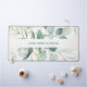 Elegant rustic style desk mat featuring a simple design with your name in between a top and bottom border of eucalyptus leaves and greenery.