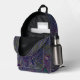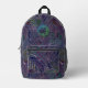 This customisable printed backpack boasts a vibrant and dynamic graphic style. The all-over print features stylised foliage in captivating shades of purple, pink, blue, and green. The leaves appear to dance across the fabric, creating a lively and modern botanical aesthetic. At the top centre, a circle awaits personalisation—the perfect spot for adding a name, monogram or custom text.