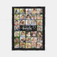 Modern Family 32 Photos Script Heart Name Custom Fleece Blanket. Wrap your loved ones in comfort and photo memories with this photo blanket featuring an easy-to-upload photo collage template with 32 square pictures the title FAMILY in a modern script typography accented with a heart swash and personalised with a family name in your choice of text, graphics and background colours (shown in white on black). Soft and cosy, this blanket makes a heartfelt gift or a meaningful addition to your own home décor. Perfect for snuggling on the couch, displaying as a keepsake or commemorating a special occasion or milestone. BLANKET OPTIONS: The sample is shown in the Small 30x40" Fleece blanket--other sizes are available on the ordering page or transfer to a Sherpa blanket or other product. ASSISTANCE: For help with design modification, resizing or transferring the design, contact the designer BEFORE ORDERING via the Zazzle Chat MESSAGE tab or email makeitaboutyoustore@gmail.com.