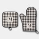 Custom-designed monogram oven mitts and pot holders featuring personalised family name monogram on black and white buffalo check design.