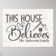 Poster features the words "This House Believes" in a grey scripted font against a faux distressed wood planked cream coloured background. Design details include a heart with a Christian cross and a house rooftop. Add your family name or custom text to make this poster uniquely yours. You can also order with frame for a finished look upon arrival.