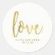 Elegant wedding sticker with modern faux gold typography love set against a white background.