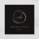 Striking black business cards in a unique square shape leave a modern impression. Front side features an abstract element in faux rose gold, encircling your initials or monogram in modern calligraphy script. Personalize with two custom text fields beneath for your name and title or business name. Add your full contact details to the reverse side. Suitable for any occupation; example shown for hair and makeup artists. NOTE: THERE IS NO GOLD FOIL ON THIS PRODUCT. The rose gold effect is created using subtle color variations that mimic the look of foil.