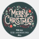 Celebrate the holidays in style with this modern round sticker featuring a dark teal background and cheerful white and red typography. The "Merry Christmas" message is adorned with holly, snowflakes, and baubles, creating a playful yet elegant design. Customisable with your family name and year, this sticker is perfect for adding a personal touch to your holiday cards, gifts, and party favours. The mix of festive elements and the trendy dark teal hue brings a contemporary flair to your seasonal greetings. Thank you for visiting.