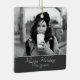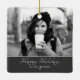 Modern Festive Script Custom Photo Holiday Ceramic Ornament. The ornament is in white, black and grey colour scheme - with photo, Happy holidays wish, your personal note and a year number in trendy white script. Insert your favourite photo into the template - black and white photo matches very well with the design. Personalise this ornament with your name and year number. It`s a great design for family, couple or single people. Perfect Christmas keepsake gift idea for your friends and family or for yourself.