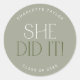 This modern fete green she did it graduation sticker is perfect for a simple grad party. The design features elegant boho typography with a touch of sophisticated style in muted and minimalist light sage green.