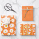 Whimsical modern gift wrap set featuring scattered flat white daisies with sunflower gold centres over a bold orange background. Set includes scattered daisy pattern with coordinating grid and daisy stripe patterns. Suitable for any occasion.