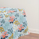 Colourful stylised, pop art flowers with blue, green, and black accents on a sky blue background make a modern and stylish tablecloth.