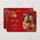 This elegant Chinese wedding thank you card features a custom photo, gold line art flowers and a golden double happiness symbol on a shimmering red background.