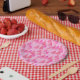 Paper plates in a pattern of Mid-Century Modern, flower embellished, Christmas trees in a silky gradient - trees in shades of pale to deep pink, accented with fuchsia, on a soft pastel pink background
