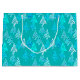 Large gift bag in Mid-Century Modern, flower embellished, Christmas trees in a silky gradient - trees in shades of soft turquoise and aqua on a turquoise / peacock background