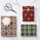 Give your holiday modern flair with these designs based on traditional Slavic folk art embroidery patterns. The artwork is a graphic rendition of a blossoming poinsettia flower. Designed in red, white, and pine green, one sheet features an all-over pattern, one sheet has the design in scattered medallions, and one has a folk snowflake pattern against a cranberry red background. Old world charm with a contemporary spin!