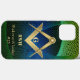 Stylish gold square and compass Masonic symbol personalised phone case with a modern fractal background.