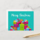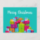 A cute , fun and modern image of wrapped Christmas presents in pink, purple, green and bright modern colours. Against a customisable bright blue background. Fun and colourful Christmas style.