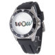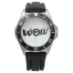 Modern, playful, bold graphic design of a word "wow" in red, yellow, blue colours. Handwritten, fun, lively brush stroke style typography.