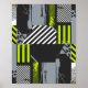 This artwork features a striking combination of geometric shapes and bold patterns. The design uses black, grey, white, bright green, and touches of brown. Diagonal and horizontal stripes dominate the layout, while textured brush strokes, splashes, and animal-like prints add depth and variety. The composition feels like a collage, balancing structured blocks with expressive, chaotic details. The contrast between vivid green highlights and muted grey tones creates a modern and edgy visual impact.
