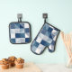 This oven mitt and pot holder set features a pattern of modern geometric checks with hand-drawn lines in shades of blue for a contemporary look.
