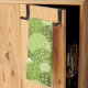 This kitchen towel or tea towel features a geometric pattern of overlapping circles with brush strokes in monochromatic shades of lime green, avocado and celery.