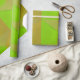 Y-shaped geometric design where lines split the square into three areas. Each area with a slightly different colour, all in green to yellow tones. The colour scheme stands out as fresh, a touch of cubism, somehow etnic, a tad psychedelic, and unique.