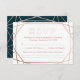 A modern and contemporary winter wedding response card, features a "faux foil" gold rose geometric pattern over a dark turquoise background. All your details are spelled in a beautiful modern typo.