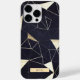 this case features a dark midnight navy blue and metallic antique gold simulated metal Abstract minimalist geometric print pattern, with a lower gold box and personalizable text in a slim minimalist sans serif font