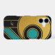 A sleek and artistic case featuring intersecting geometric shapes in teal, mustard, beige, and cream, outlined with elegant gold lines and a refined monogram, a perfect mix of modern and luxurious style.