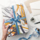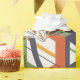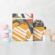 Bold modern floral pattern wrapping paper featuring minimalist tulip line art layered with striking geometric blocks in orange, green, and navy blue on a clean white background. A high-contrast, graphic design with a fresh contemporary vibe.