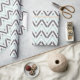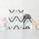 Modern wrapping paper with geometric mint blue, white, grey chevron pattern.