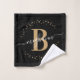 Girly, elegant, trendy, modern, black and gold monogram initial name script custom personalised monogrammed bath towel set. Featuring a monogram initial and a girly name script in a hand lettered calligraphy swash tail font and dotted circle frame around your monogram. Perfect feminine gift for sister, mother, girlfriend, bridal shower, birthday, wedding, sweet 16 birthday party, or anyone who loves pretty girly modern style.