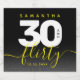 Celebrate the big three oh with this stylish modern design, which features striking black, white, and bright yellow block and handwritten lettering set on a rich black to smoky grey background.