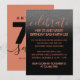 Celebrate her big seven oh with this stylish modern colorblock invite, which features striking black, white, and copper block and handwritten lettering set on rich-black-to-smoky-grey and copper backgrounds.