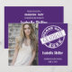 This modern photo graduation party invitation design features a white circle as a stamp with white typography that reads “class of” and the graduation year. Purple background colour and white text.