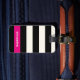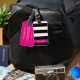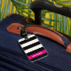 Chic luggage tag features wide black and cream stripes with a magenta pink colorblock accent. Customise the back with your name and contact details.