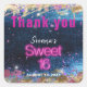 Introducing an exquisite, personalised Thank You sticker design for a modern Sweet 16 birthday celebration. This captivating sticker showcases a mesmerising blue glittery backdrop embellished with elegant faux gold foil. Vibrant purple and pink paint splatters add a playful touch, while twinkling lights bring a magical ambiance. The centerpiece of this trendy design is the "Sweet 16" text, artfully crafted in a captivating hot pink neon typography. Enhance your celebration with this stunning sticker, a perfect blend of contemporary style and heartfelt gratitude.