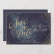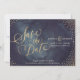 Glamour gold hand lettering calligraphy design and gold dots confetti on dark navy sky night watercolor background, shimmer faux metallic gold glitter effect, modern, chic, elegant and classy, perfect for vintage wedding or winter wedding in evening. Custom your own save the date card for your wedding invitation set.