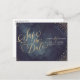 Glamour gold hand lettering calligraphy design and gold dots confetti on dark navy sky night watercolor background, shimmer faux metallic gold glitter effect, modern, chic, elegant and classy, perfect for vintage wedding or winter wedding in evening. Custom your own save the date postcard for your wedding invitation set.