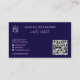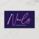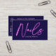 Modern glam purple neon nails technician manicurist script logo qr code business card, add your social media, logo and qr code on dark navy blue