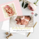 Simple and elegant photo birth announcement card introduces your beautiful newborn baby girl with a landscape feature photo on the front and a bonus square photo on the back. Personalise the modern real gold foil hand-lettered script with baby's full name and customise the soft black text with all of the important birth stats. A pattern of white abstract polka dots dresses up the back of this two-sided card design. The light ballet slipper pink background colour on the back of the card can be modified to coordinate with your photos.