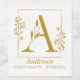 Stylish bottle label features gold hand-drawn botanical frame with botanical letter A in centre. Personalise with couple's name and date