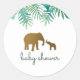 A trendy sticker with a faux gold mummy and baby elephant, "baby shower" in a cute script font and a border of lush green tropical leaves.
