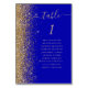 The left-hand edge of this elegant modern wedding table number card features a gold faux glitter border. The word "table" appears in gold-coloured whimsical handwriting script on a royal blue background. Add the names of your guests who are assigned to each table.