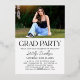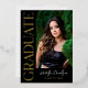 Make a stunning impression with this modern graduation party invitation featuring a bold single portrait photo alongside "Graduate" in gold foil running vertically on a sleek black background. The back displays a second photo with "Grad Party" event details in black script and serif typography on white. All text is fully customizable, including the graduate's name, class year, and event details.