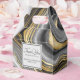 A personalised wedding favour box with an abstract design with an agate geode mineral pattern. Gold, grey, white, and black swirl together forming elegant waves of colour. A light grey square with a thin black border layered over top with your text inside.