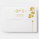 This is a graceful wedding envelope that features a gold line with a branch with leaves and a dot on the right positioned against a white background. Your initials and dots are on the flap. It is part of our “Jewellery inspired gold foil wedding invitation collection” wedding suite.