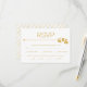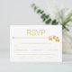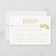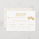 This elegant wedding RSVP card has a gold line and a branch with leaves on the right, plus a dot on the left, against a white background. On the reverse side, you'll find a stylish diagonal pattern of the couple's names in gold on white, adding a sophisticated grace. If the names on the backside require more or less space, you can customise it to adjust the text size accordingly.