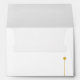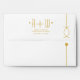 An elegant wedding invitation benvelope that features a gold line with two overlapping semi-circles on the right and a dot on the left positioned against a white background. Your initials and dots are on the flap. It is part of our “Jewellery inspired gold foil wedding invitation collection” wedding suite.