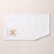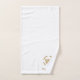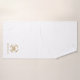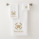 A modern minimalist gold monogram logo or letter mark in a circle with your name underneath, featured on a white towel set, for a chic modern vibe. Add your own first name letter and your name.
