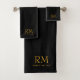 An elegant modern minimalist bathroom towel set featuring gold serif initials and name in a clean sans serif font, on a black background.