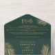Modern chic gold palm tree tropical wedding all in one invitation on editable emerald green, with details main invite and rsvp , featuring gold foil palm tree leaf and elegant script.
