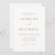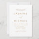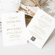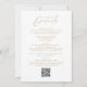 Simple and elegant all-in-one wedding invitations featuring a gold, handwritten script mixed with modern lettering against a white background. Personalise the front of the minimalist wedding invitation with your name and wedding details. Personalise the back of the invitation with wedding details such as reception information, hotel accommodations, RSVP instructions, and wedding website. Add your desired wedding website link to the provided QR Code template so your guests can easily RSVP online and view additional wedding information. The gold all-in-one wedding invitations are the perfect choice for modern weddings.